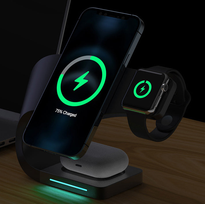 The 4 in 1 Magnetic Wireless Charging Stand is an all-in-one charging solution, elegantly designed to power up your smartphone, earbuds, smartwatch, and a fourth device simultaneously. Its compact, space-saving design makes it the perfect accessory for any desk or nightstand, keeping all your devices charged and organized.